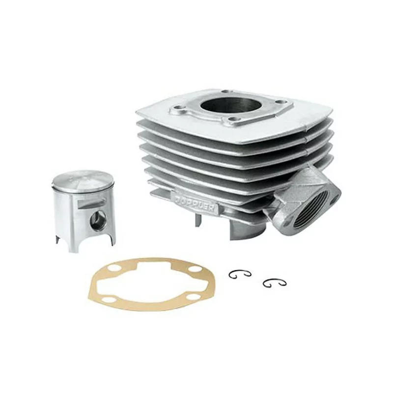 Le cylindre ER1 est à balayage 5 transferts avec des lumières d'échappement à booster en aluminium. En aluminium pour une meilleure dispersion de la chaleur, il dispose d'un revêtement nikasil. Ainsi, on obtient une surface de frottement à faible coefficient et d'une très grande résistance. Le piston de forme elliptique est composé d'un mono segment (fin 1 mm) en acier chromé dur. DOPPLER conseille d'associer son cylindre à la culasse DOPPLER (réf : 192270).